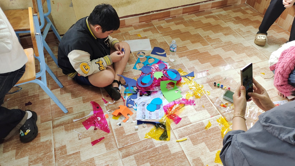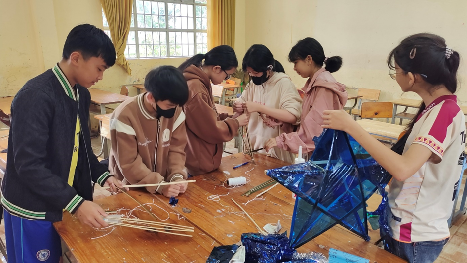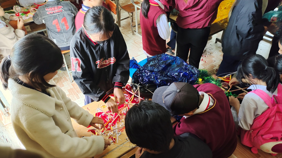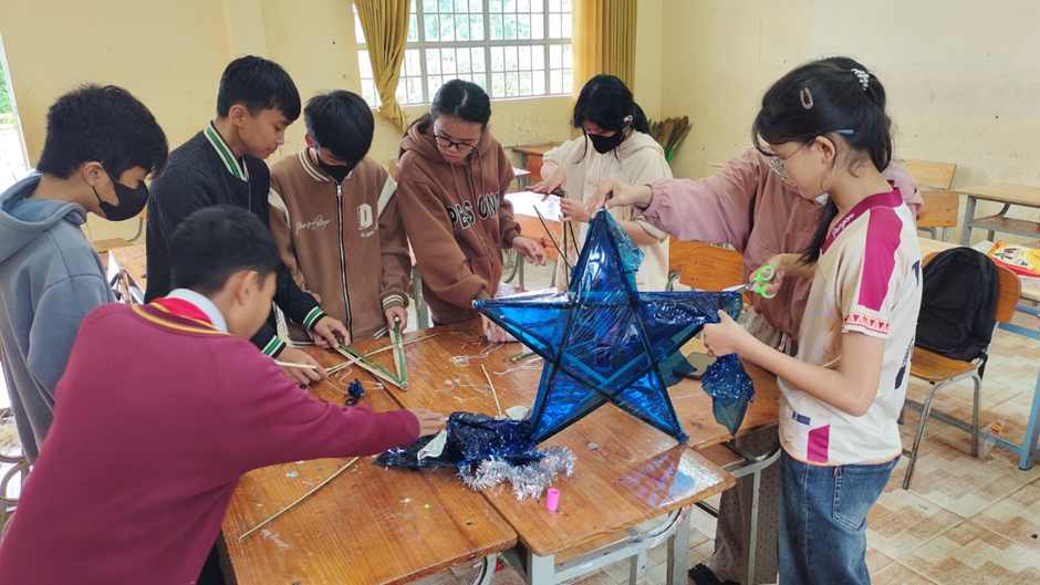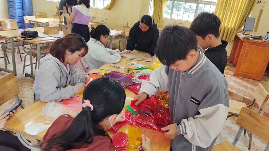 Thầy cô và học sinh cùng nhau chuẩn bị vật liệu trang trí lồng đèn và mâm cỗ