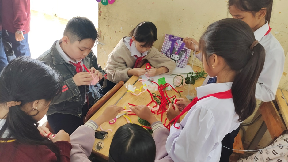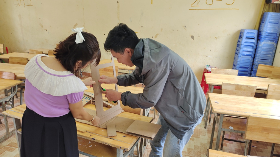 Phụ huynh cùng học sinh và giáo viên phối hợp chuẩn bị gian hàng